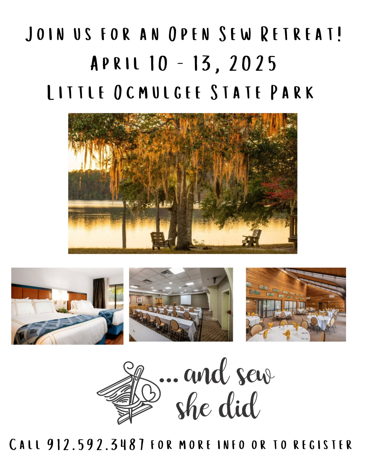 Join us for an Open Sew Retreat at Little Ocmulgee State Park! Enjoy a three-night stay in the Lodge (double beds, private bath) with breakfast and lunch provided. Price is $575 for double occupancy, single occupancy is available for an additional $250. Downpayment of $200 is due upon booking with balance due by March 10, 2025. Please add a note of your t-shirt size. Come join the fun!!